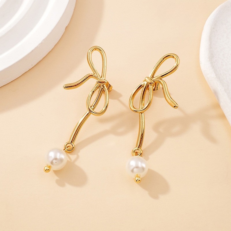 Aretes dorados 5cm moñita y perla cantidad