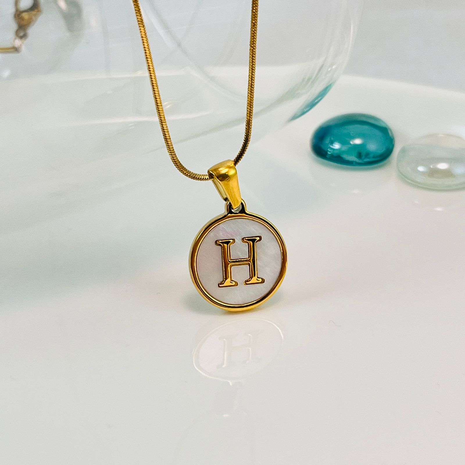 Collar dorado dije círculo nácar letra H cantidad