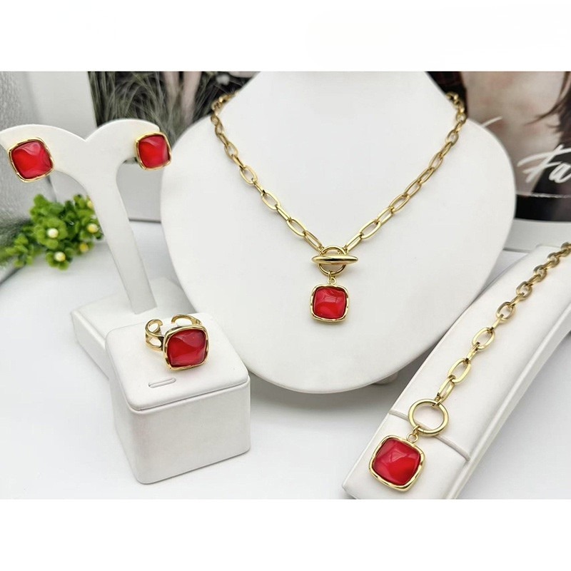 Set dorado 4 piezas piedra roja