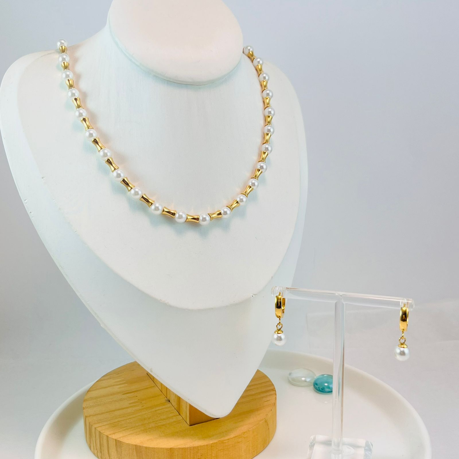 Set dorado Collar y Argollas perlita cantidad